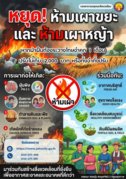 กองสาธารณสุขและสิ่งแวดล้อม เทศบาลตำบลจอหอ ได้จัดทำโปสเตอร์ประชาสัมพันธ์ รณรงค์หยุดการเผาขยะและการเผาหญ้า หากฝ่าฝืนต้องระวางโทษจำคุก 1 เดือน  ปรับไม่เกิน 2,000 บาท หรือทั้งจำทั้งปรับ